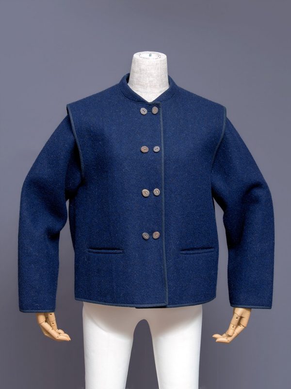 Comme Des Garcons early 1980s blue wool jacket w/ button-off sleeves and deer antler buttons.