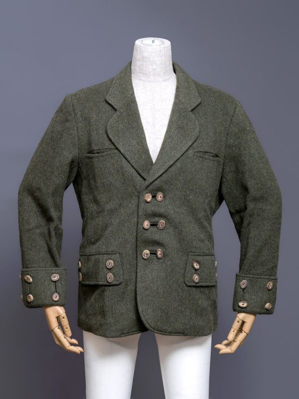 Comme Des Garcons early 1980s green-ish wool jacket with deer antler buttons.