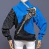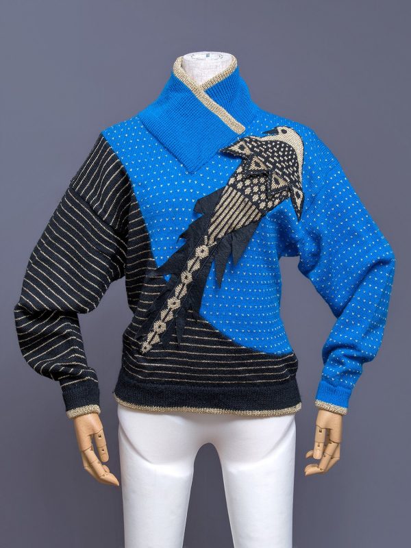 Kansai Yamamoto blue and black with gold trim knit bird sweater, 1980s or 1990s.
